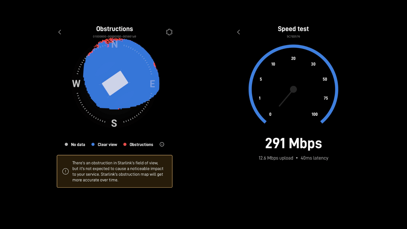 Source: Starlink App Speed test and Obstruction Reports