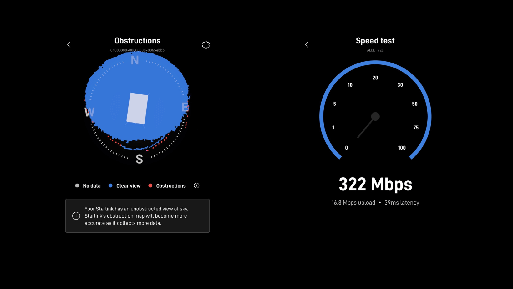 Source: Starlink App Speed test and Obstruction Reports